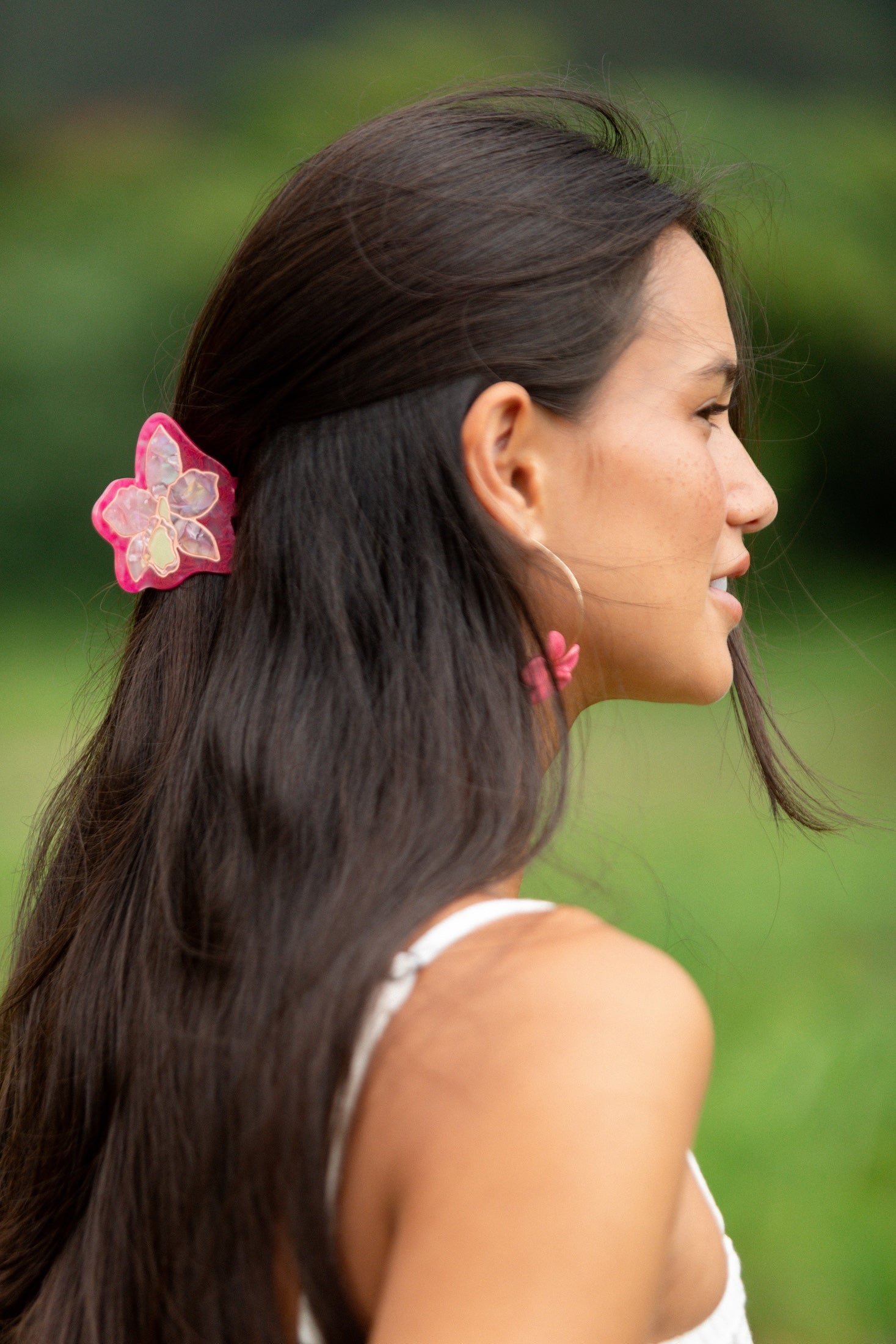 The Yireh + Coopmonster Orchid Clip is inspired by our Isle Orchid print. While orchids aren’t native to Hawai‘i, they hold a special place in our local culture—often gifted, used in leis, and to mark celebratory moments. They symbolize joy, beauty, and strength. Just as orchids bloom in unique colors and sizes, the orchid clip comes in two different shades and sizes: hot pink and peach, small and large.
