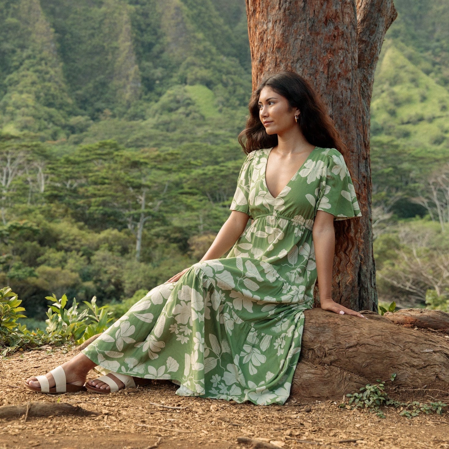woman with brown hair wearing green v neck maxi dress with native Hawaiian plants
