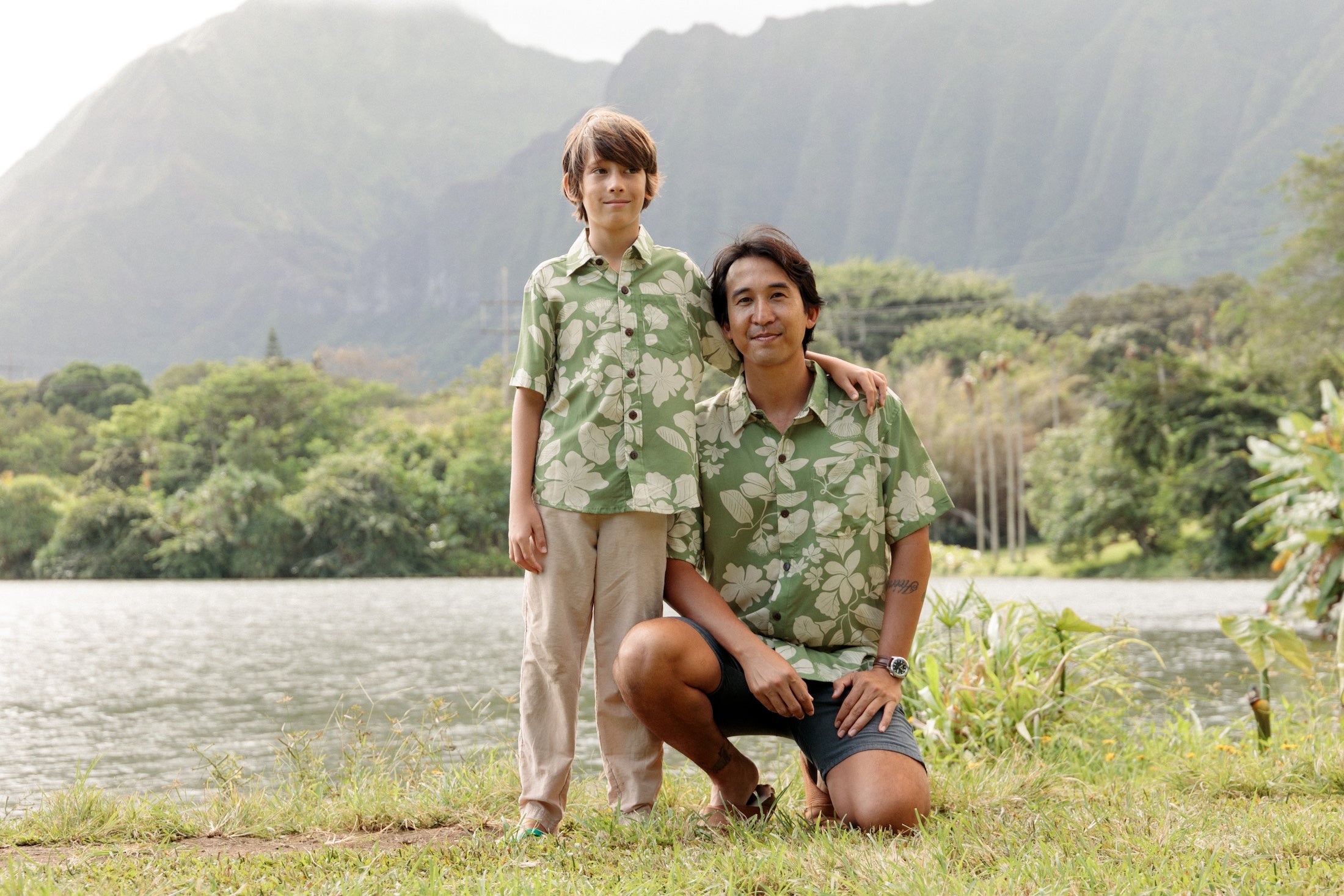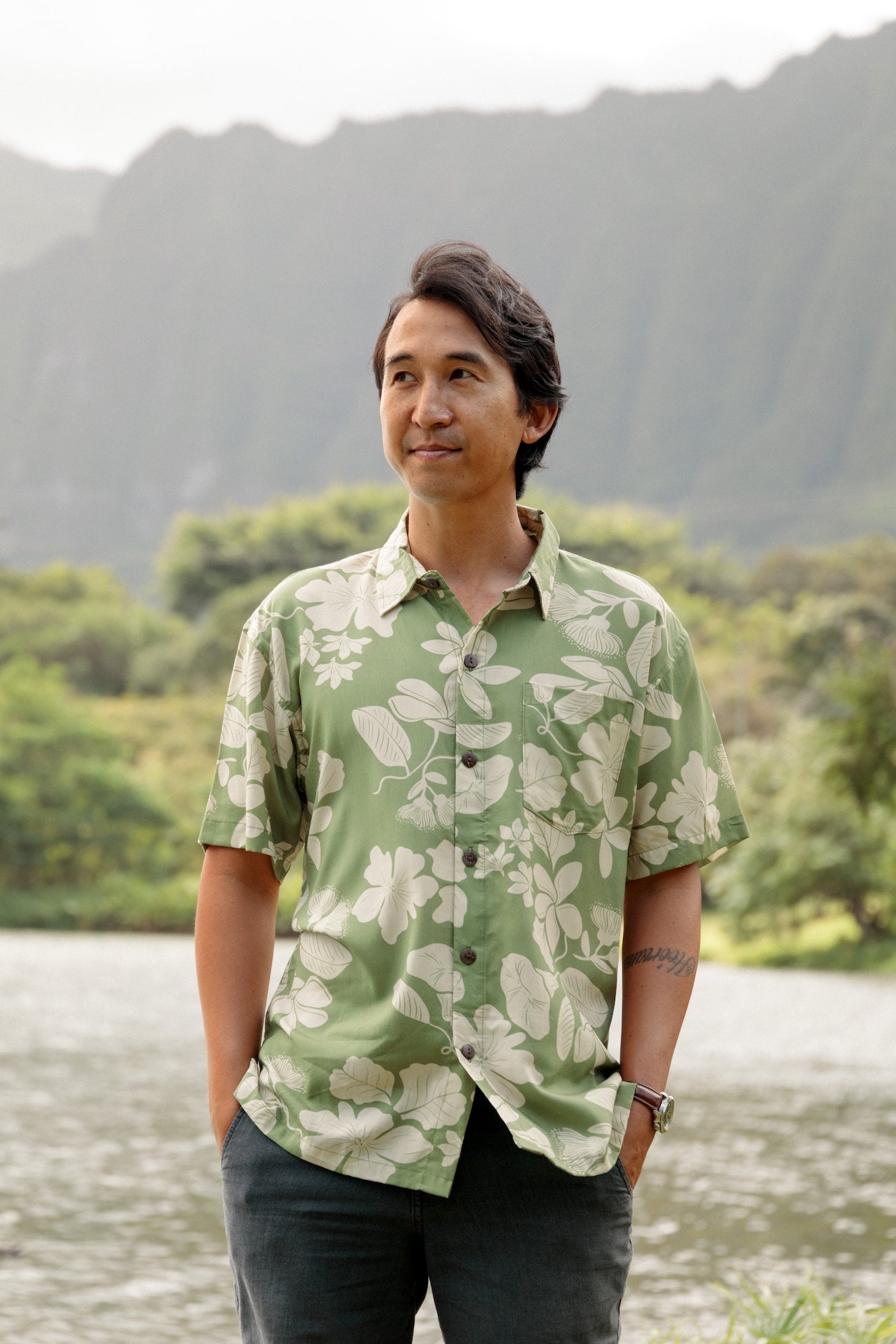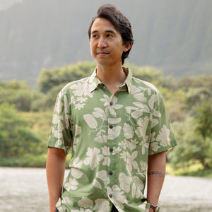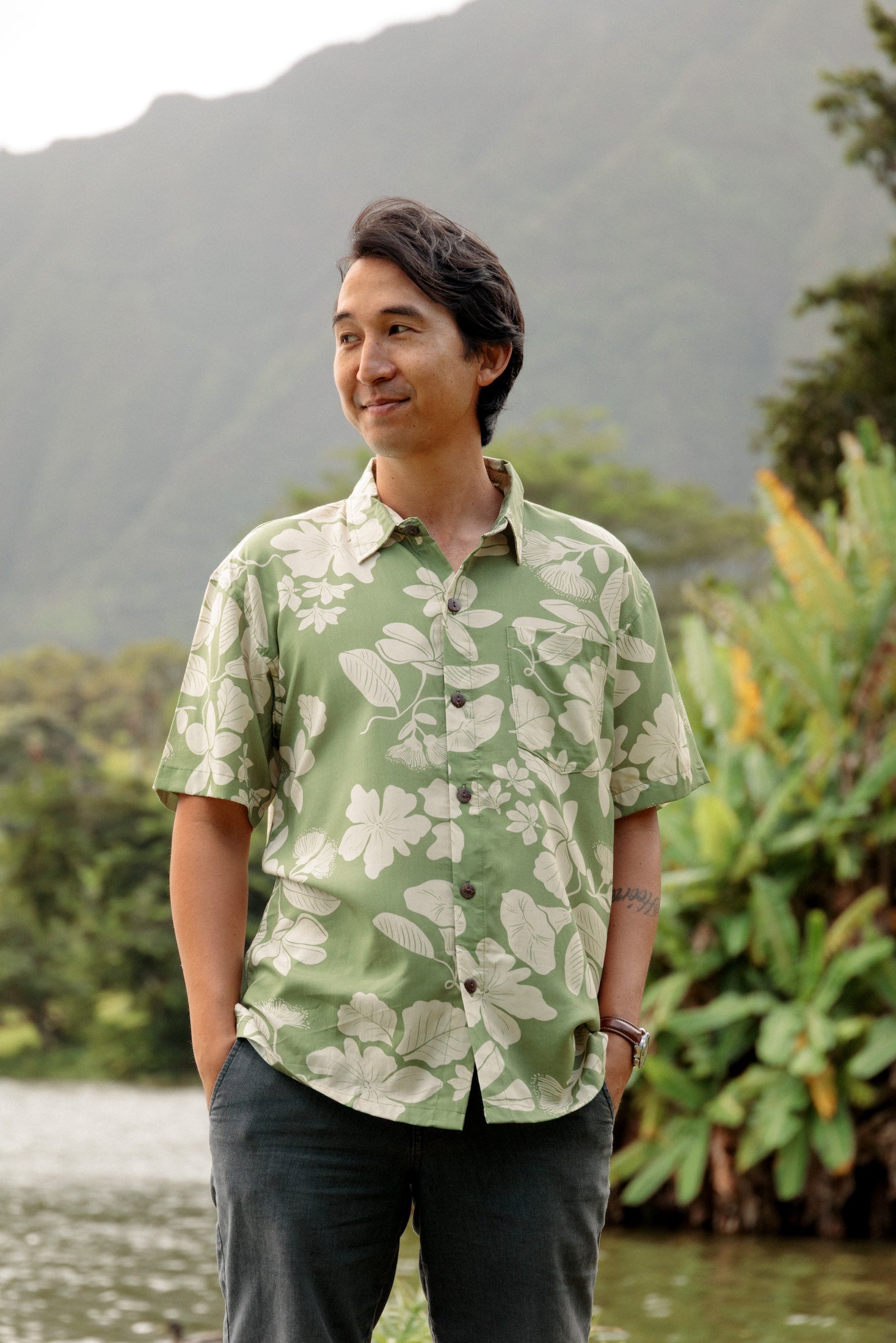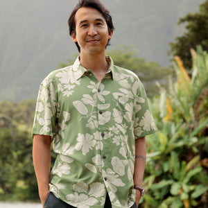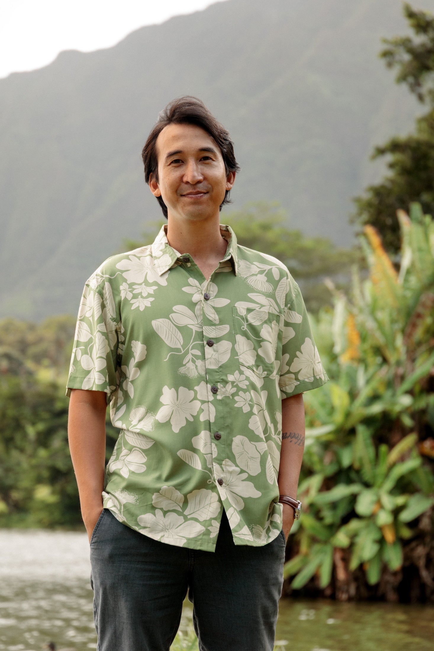man wearing green aloha button up shirt with Native Hawaiian plant pattern