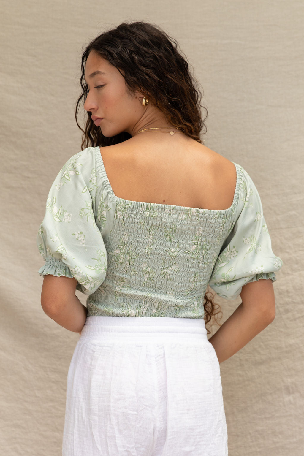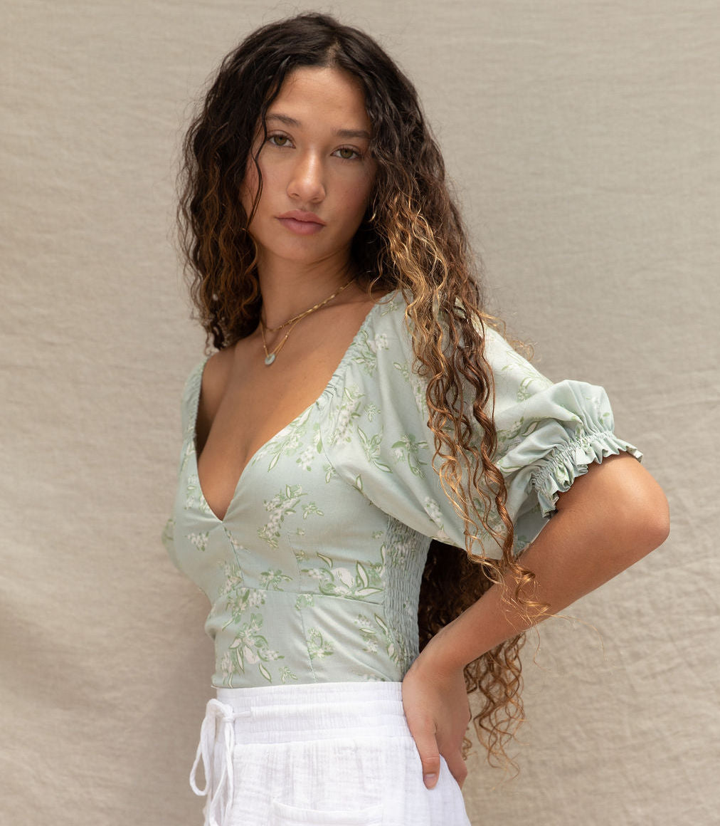 The Kate Top features a deep v-neck, puffed sleeves, and smocked back. The sleeves can be worn on or off the shoulder, and the fit is feminine + curve-hugging.