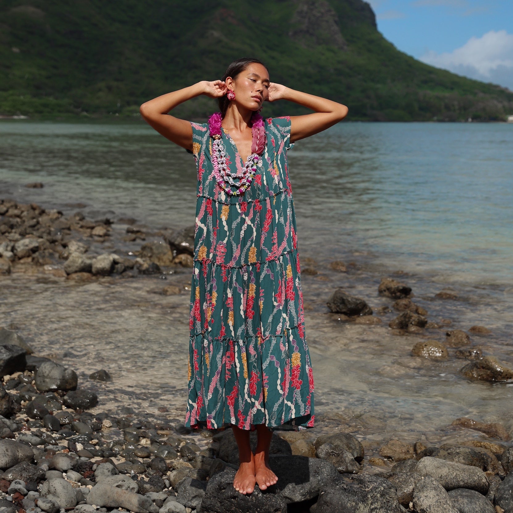 Our exclusive and one-of-a-kind prints are inspired by a mix of our island home in Hawai'i and the places we've traveled. We work with artists to design our prints and then our fabrics are made to order especially for us. We print our fabrics in eco-friendly techniques that use little to no water and non-toxic dyes. Our scrap fabrics are either donated to micro-businesses around the factories we partner with or repurposed to create our scarves and sarongs. Our goal is to leave behind as little as possible and give you peace of mind with every purchase.