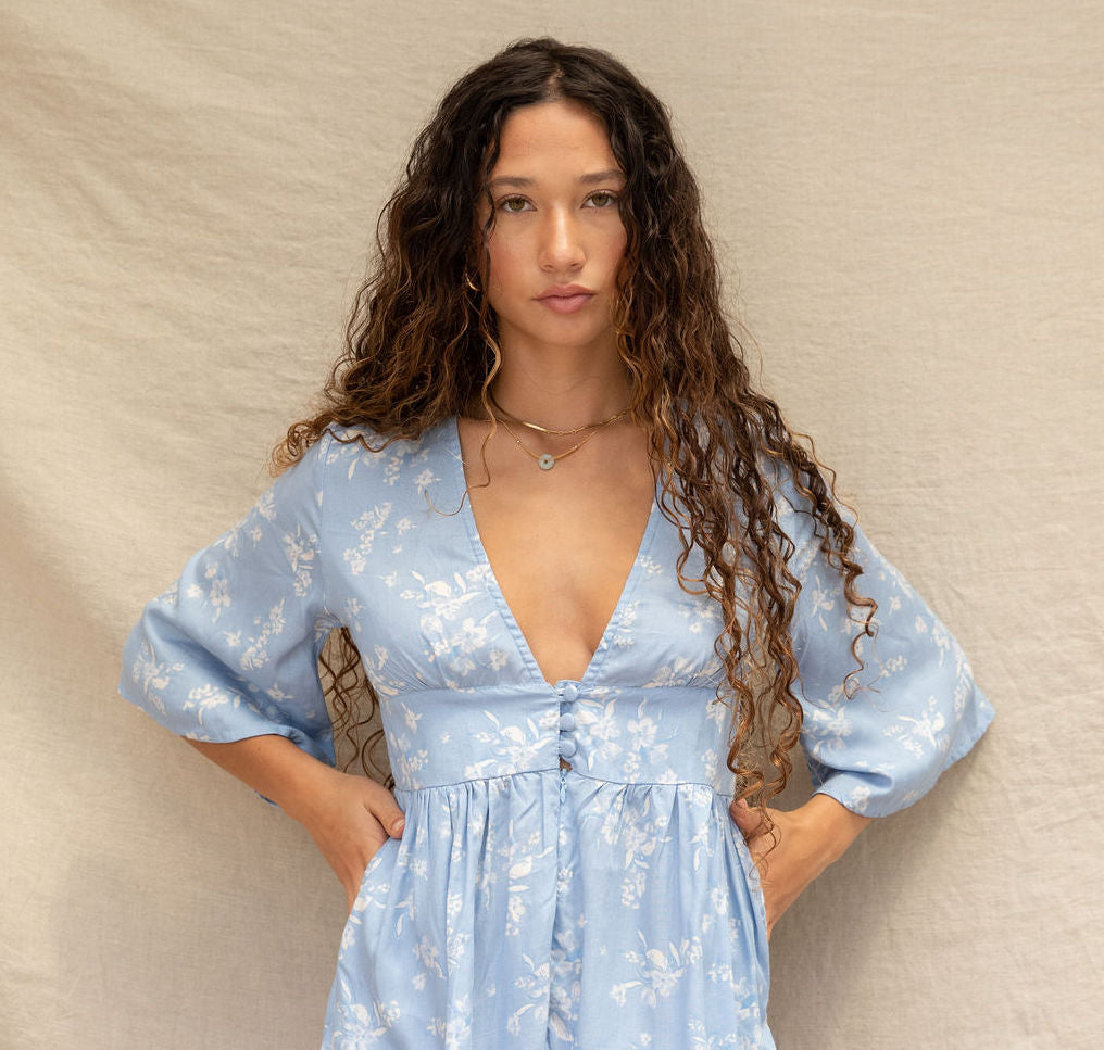 The Nora Playsuit is effortlessly chic with a bold and elegant touch. Designed with a deep v-neckline, covered buttons, flowy half length sleeves, and pockets, the Nora Playsuit is the definition of easy elegance and is perfect for everyday wear. Ethically made in Bali, Indonesia.