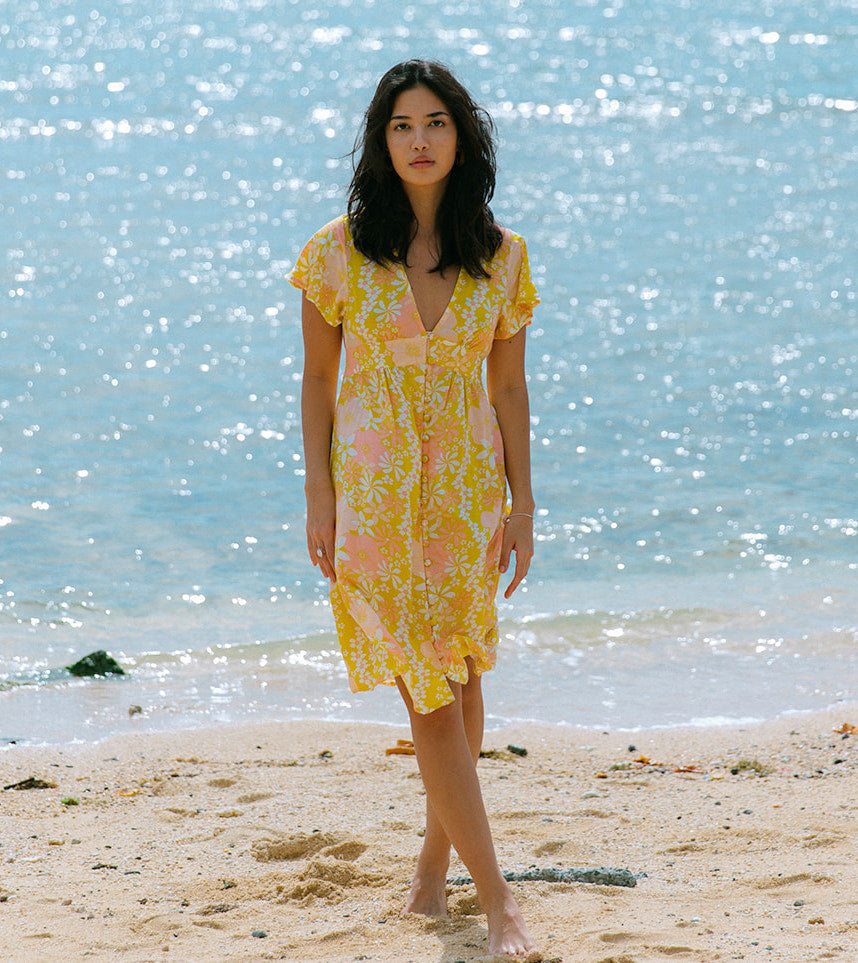 The Brynn dress is my favorite style from Yireh (I have the Brynn in 4 other patterns)! Eternal Summer & Yireh are two of my favorite local Hawaii brands so this Brynn dress is a DREAM collab. I love the native Hawaiian flowers referenced in the design, as well as the cheerful, bright colors. I'm 5'0" and this dress is a true midi length on me. I usually layer the dress over a cami for more coverage.