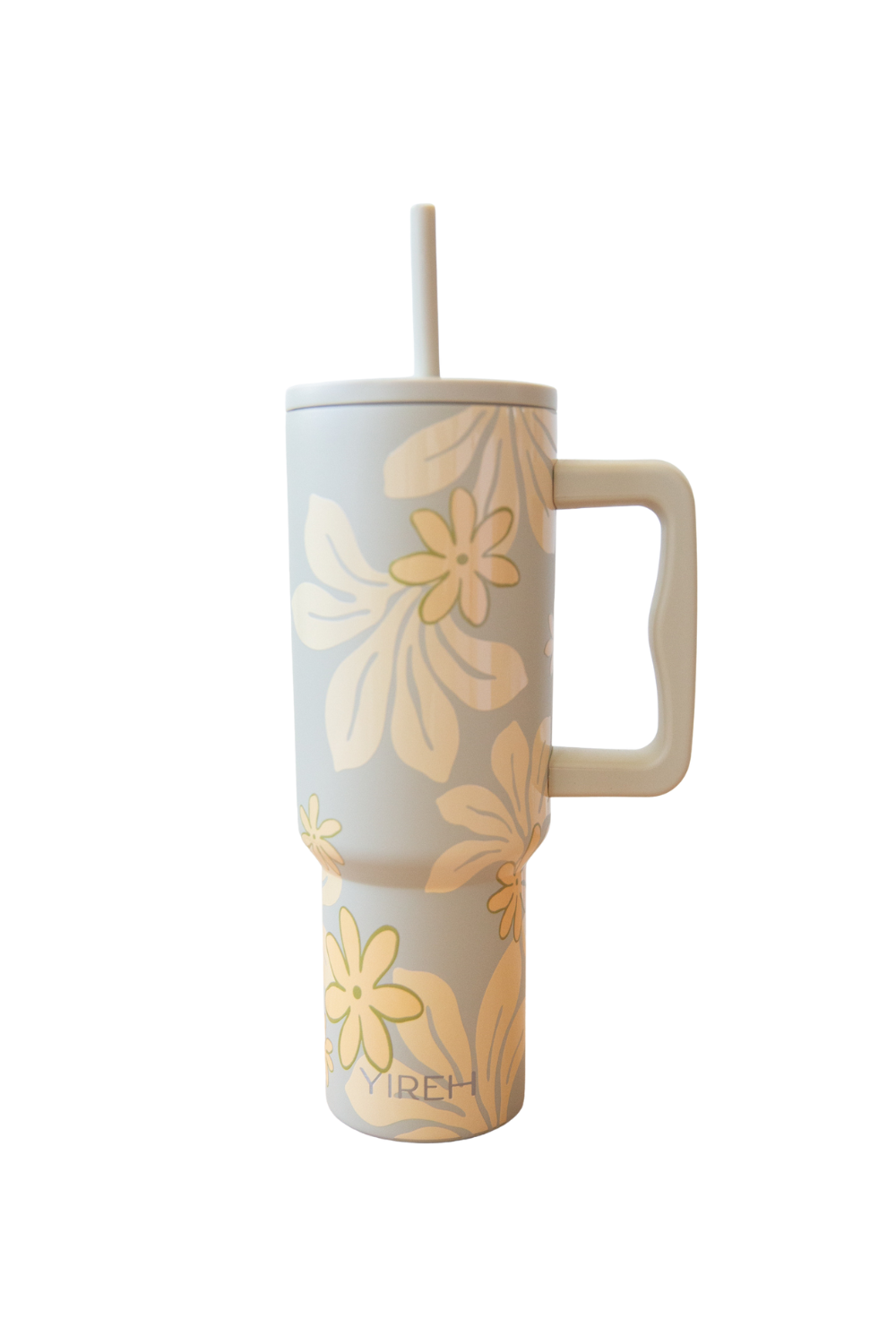 Stay hydrated in style with our 40 oz stainless steel tumbler. Designed with a sturdy handle and reusable straw, the YIREH tumbler will keep your drinks hot or cold all day long! Perfect for mornings at the gym, long days at work, running errands, sunny beach days, and so much more!