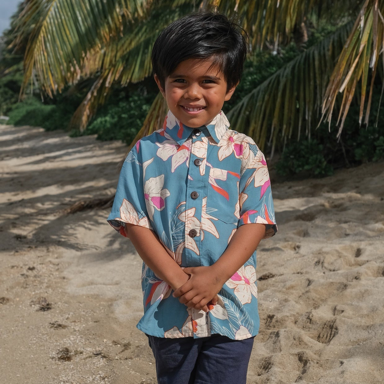 The Maverick Button-Up is a playful mini version of our Men's Kahana Button-Up, designed just for your keiki. Featuring a classic collar, a chest pocket, coconut buttons, and vibrant floral patterns, the Maverick Button-Up is the perfect mini aloha shirt. Ethically made in Bali, Indonesia