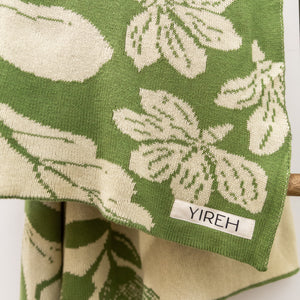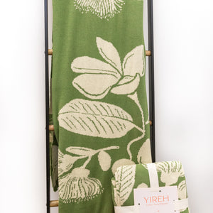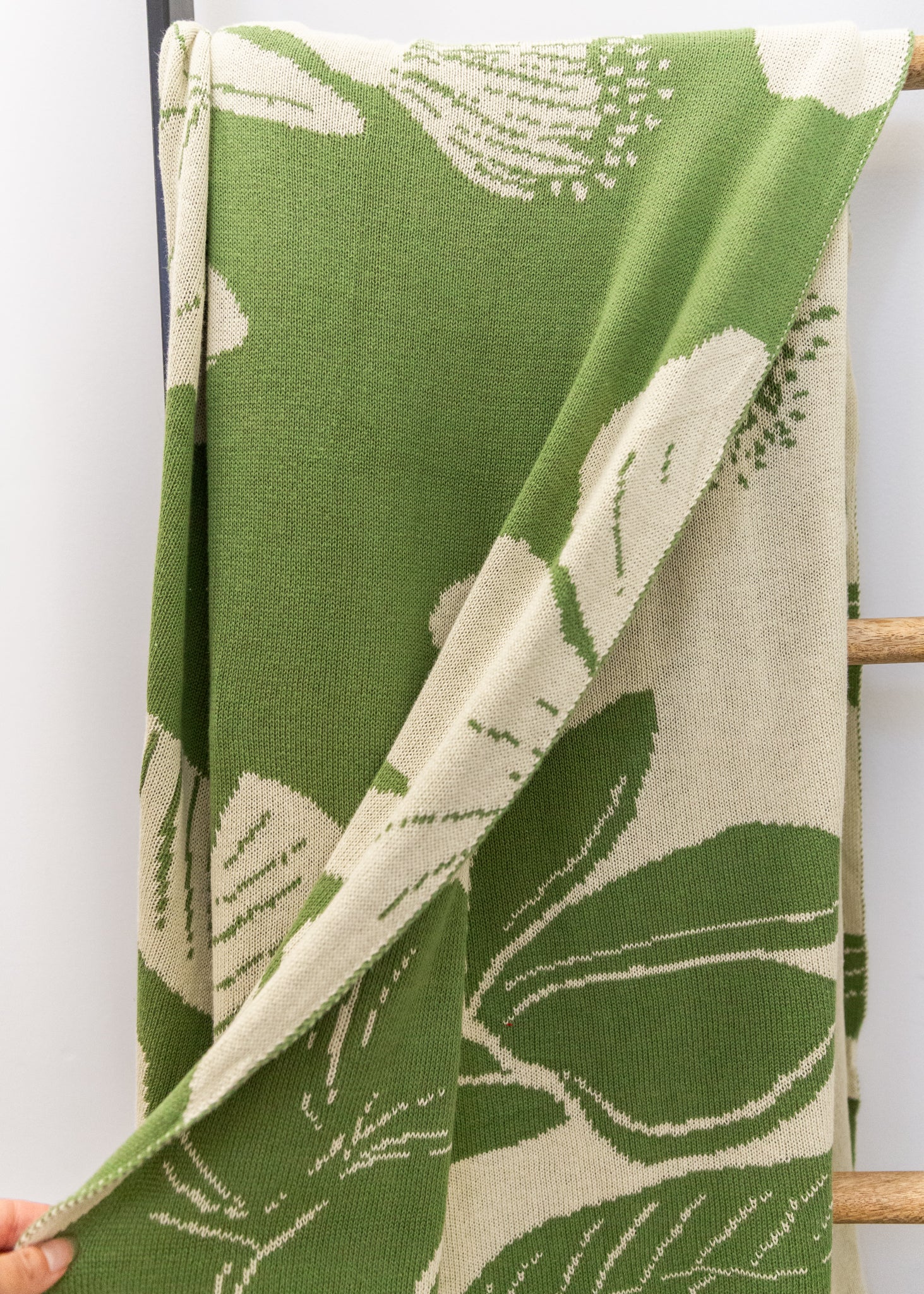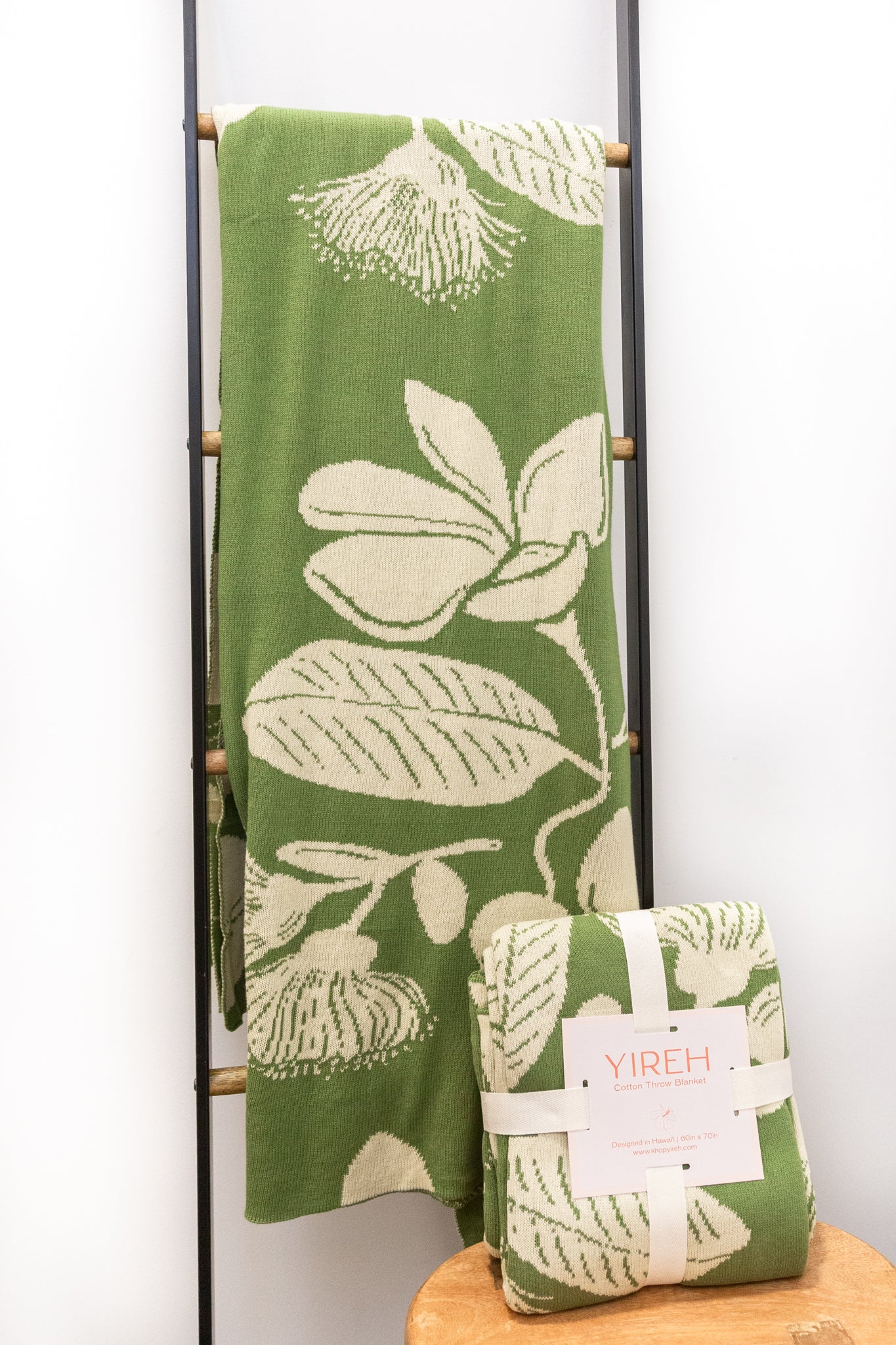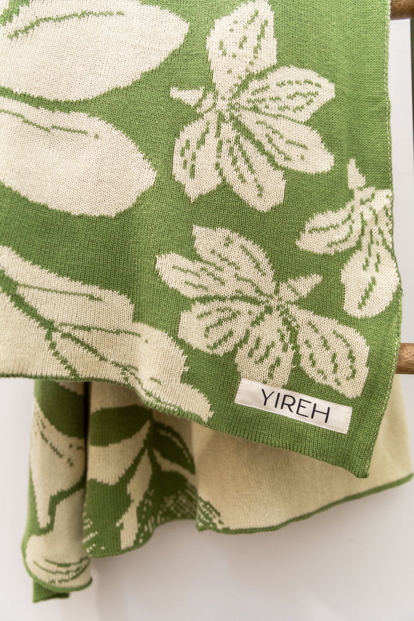 The Woven Cotton Blanket is a versatile and comfy essential for life on the go. Whether you're lounging at home, relaxing at the beach, traveling, or styling it as home decor, it’s designed to keep you cozy wherever you are with a touch of local flair. This blanket is reversible, one side has a green background and the opposite side is cream. It’s soft, breathable, and perfect for year-round comfort. Blankets are approximately 5 feet x 6 feet.