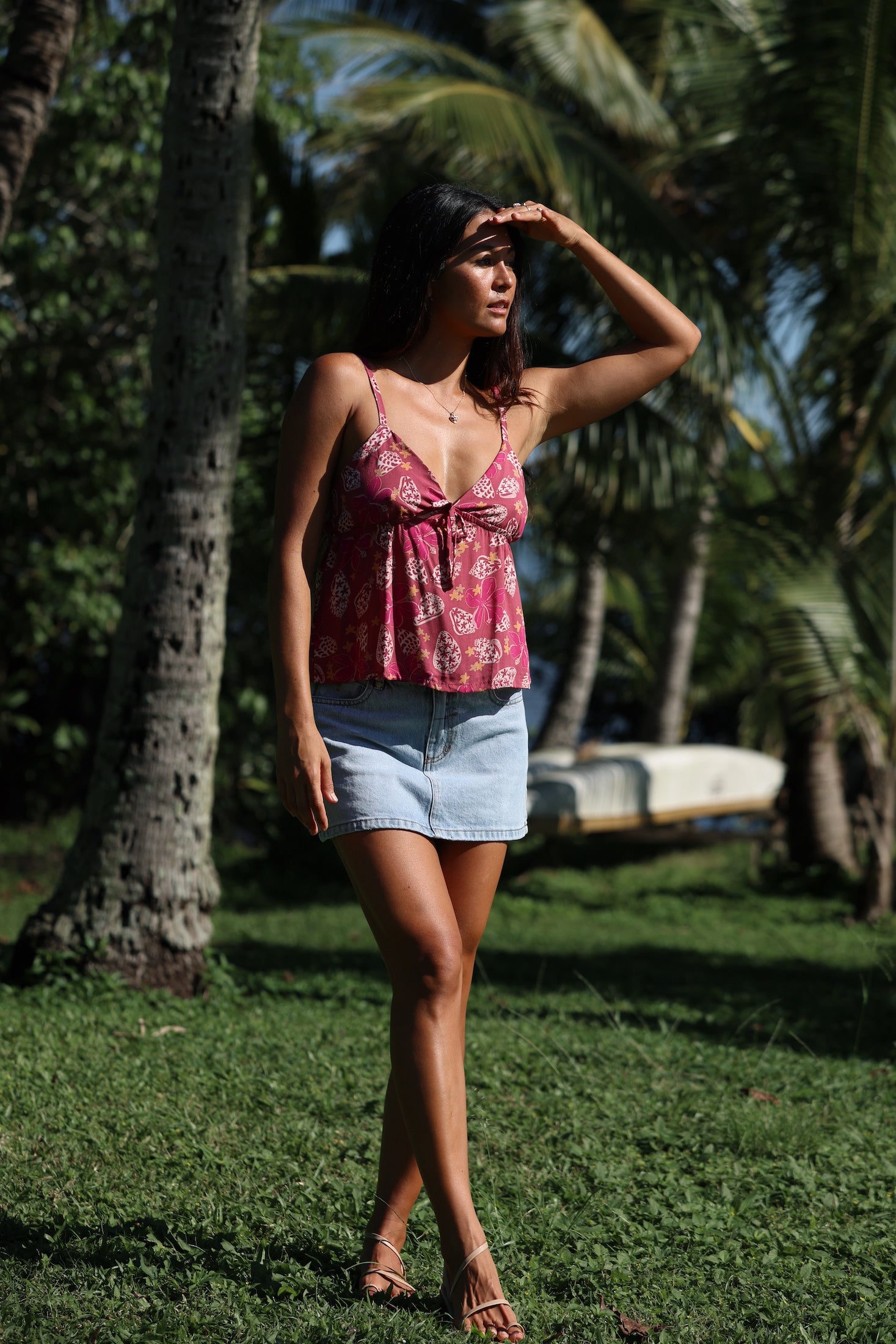 woman with brown hair wearing a pink spaghetti strap top with bow detail with shell and pua print