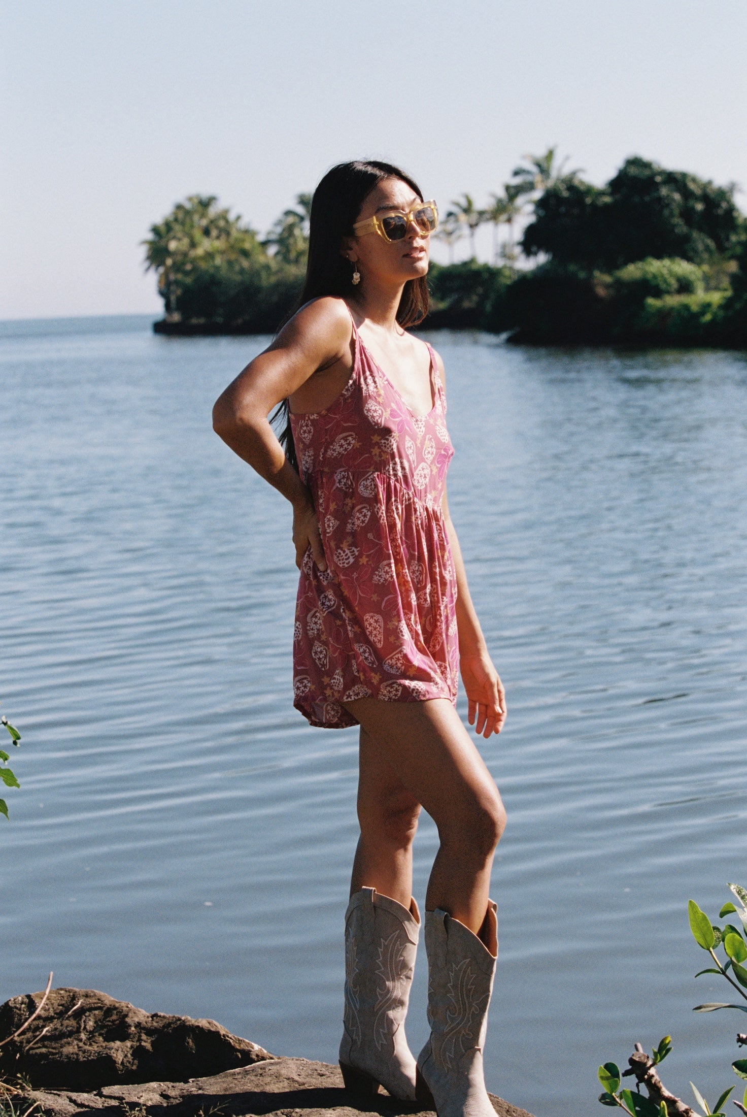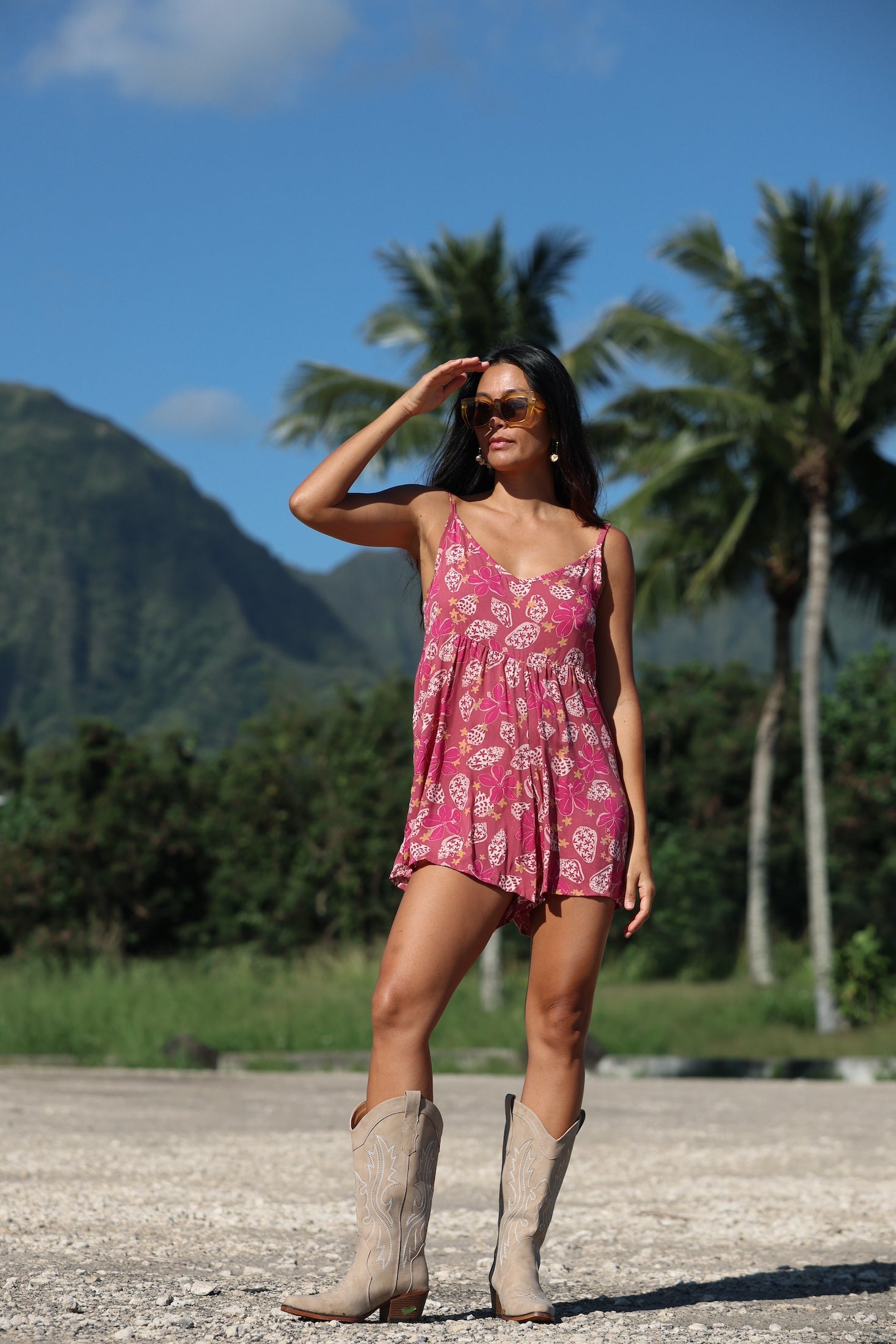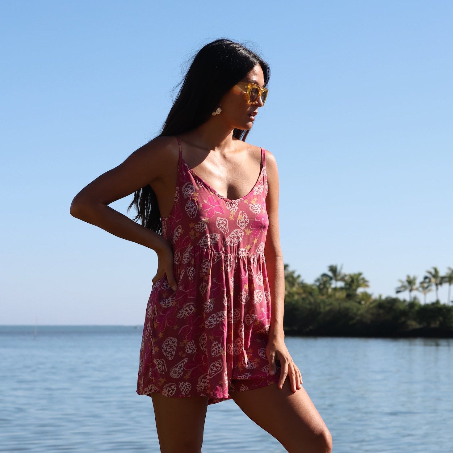 woman with brown hair wearing saghetti strap romper with shell and pua print in a pink color