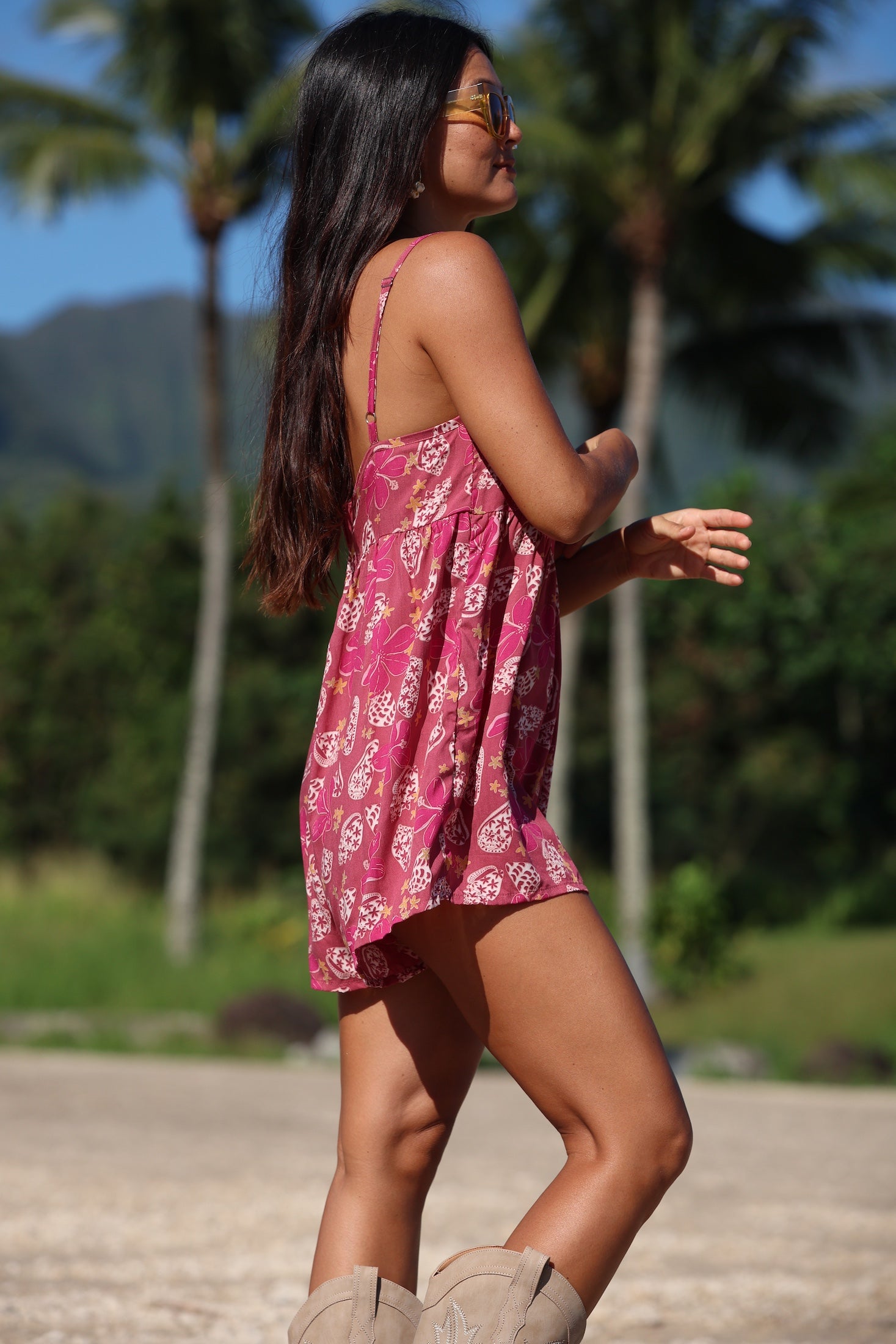 woman with brown hair wearing spaghetti strap romper with shell and pua print in a pink color