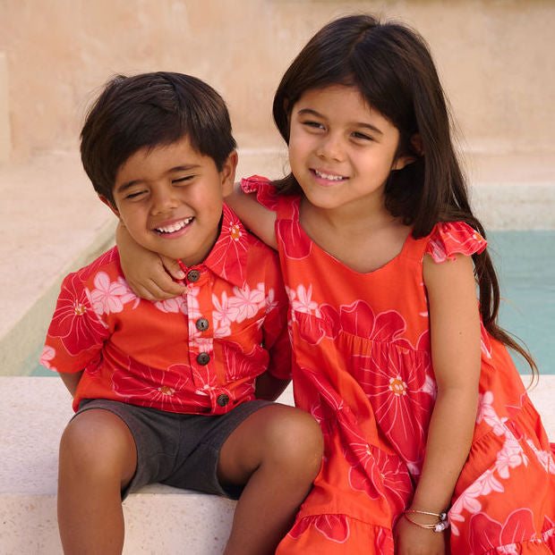 The Maverick Button-Up is a playful mini version of our Men's Kahana Button-Up, designed just for your keiki. Featuring a classic collar, a chest pocket, coconut buttons, and vibrant floral patterns, the Maverick Button-Up is the perfect mini aloha shirt. Ethically made in Bali, Indonesia