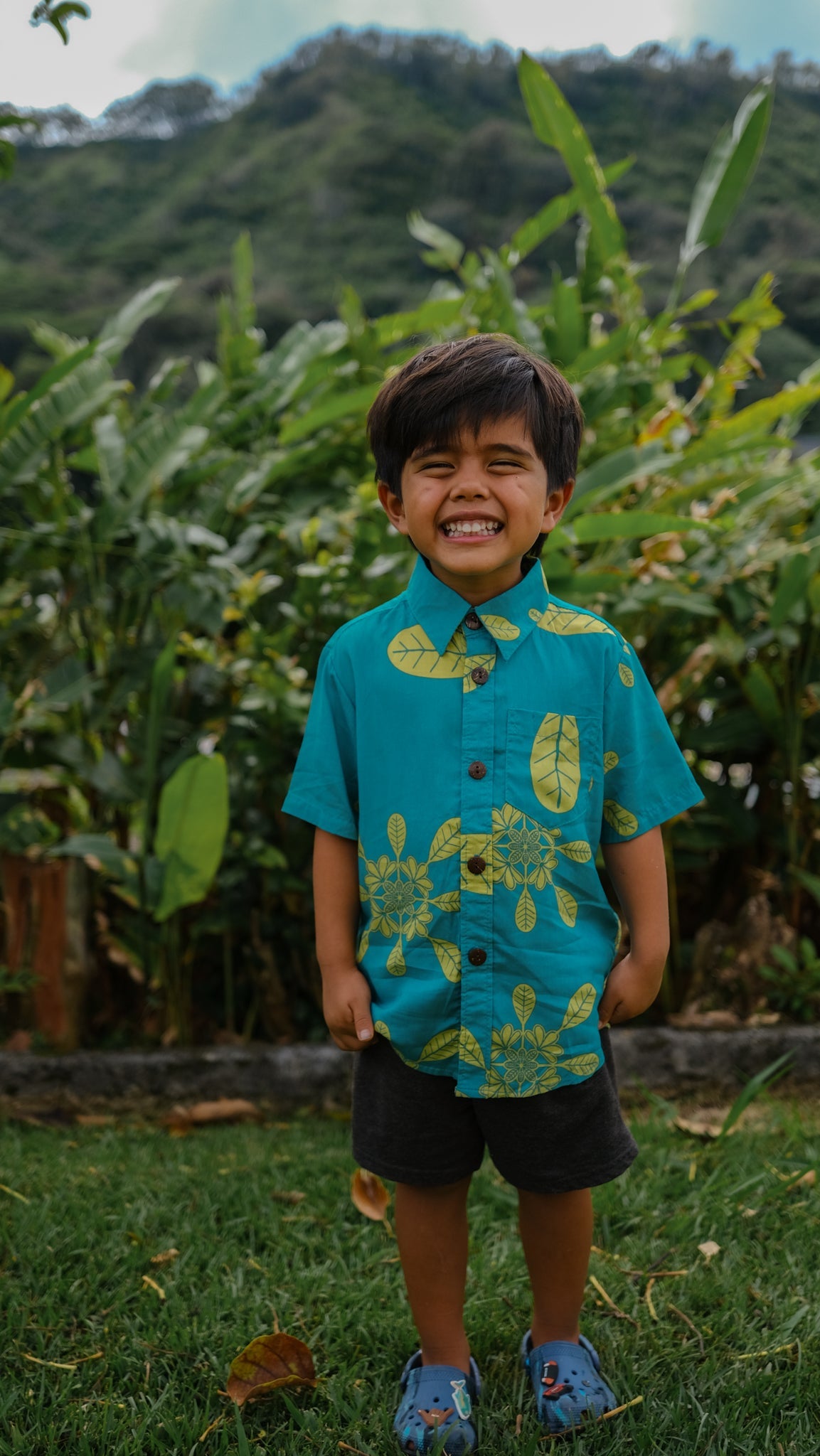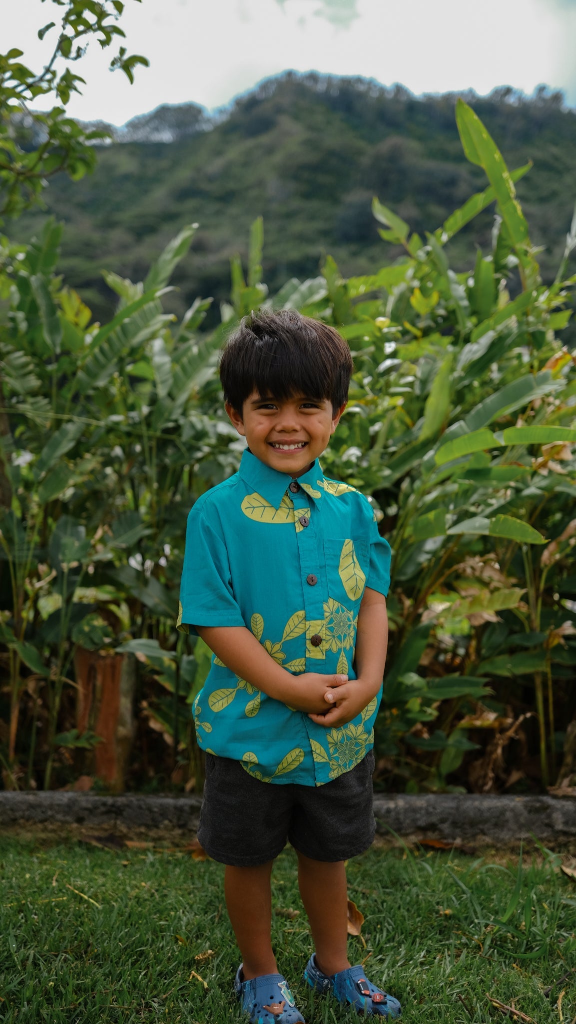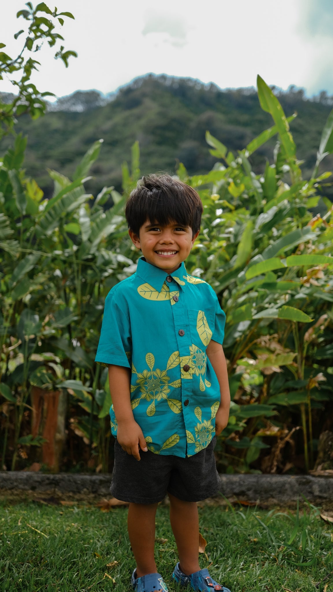 The Maverick Button-Up is a playful mini version of our Men's Kahana Button-Up, designed just for your keiki. Featuring a classic collar, a chest pocket, coconut buttons, and vibrant floral patterns, the Maverick Button-Up is the perfect mini aloha shirt. Ethically made in Bali, Indonesia