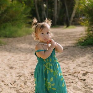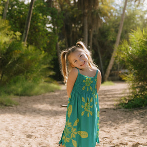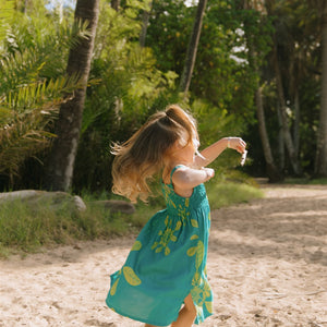The Kaia Dress is the perfect dress for playing in style. Featuring thin adjustable straps, a stretchy smocked bodice, and a roomy knee length skirt, the Kaia Dress is as comfortable as it is cute! Ethically made in Bali, Indonesia.