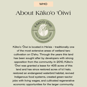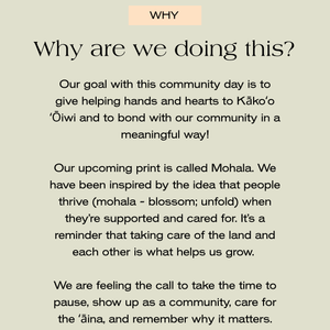 You can sign up for this community event by adding this to cart and checking out! You'll need to complete a waiver of participation for Kāko'o 'Ōiwi and by purchasing this ticket, you agree to be photographed - as we'll be documenting and sharing about the day. Please contact care@shopyireh.com with any questions!