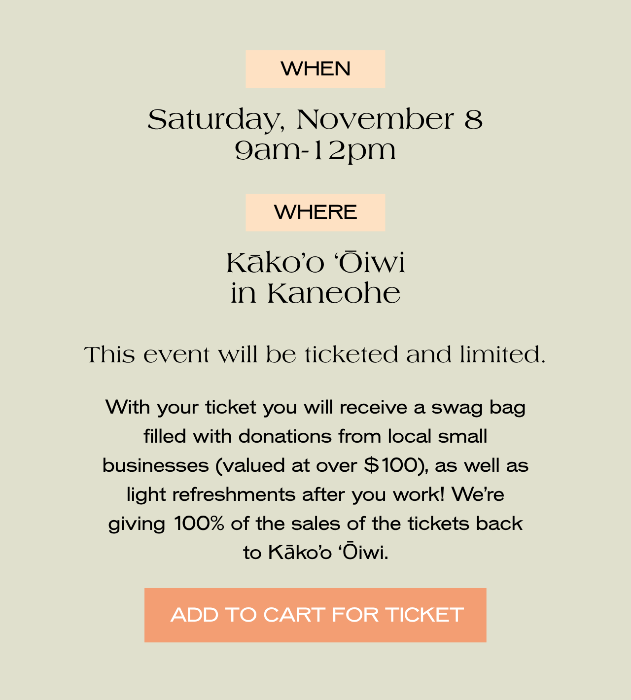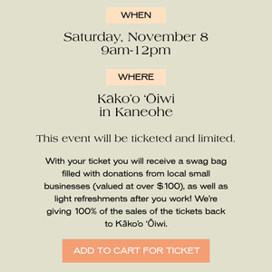 The purchase of this ticket invites you to join us in a private work day in support of Kāko'o 'Ōiwi and includes light refreshments, and a swag bag (valued at over $100) filled with goodies from local brands. 100% of proceeds will be donated back to Kāko'o 'Ōiwi. All ages are welcome. We'll be sending out a confirmation email with all of the info you'll need to know, a waiver, and reminders just before the event.